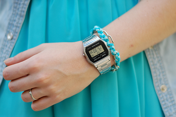 Šaty - C&A, džínová košile - Terranova, sandálky - Bata, hodinky Casio - hodinky-365.cz, náramek - DIY, náušnice - Gate, hair cuff - bornprettystore.com